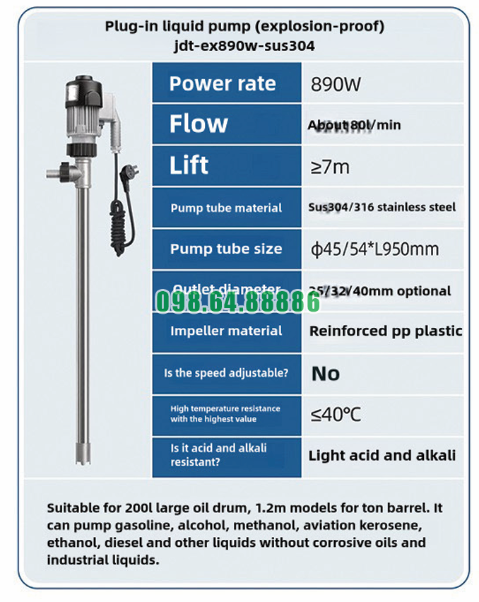 Máy bơm chất lỏng cắm trực tiếp chống cháy nổ JDT-EX890W-SUS304 cho phép bơm dầu hỏa với tốc độ ổn định, giúp rút ngắn thời gian chiết rót.