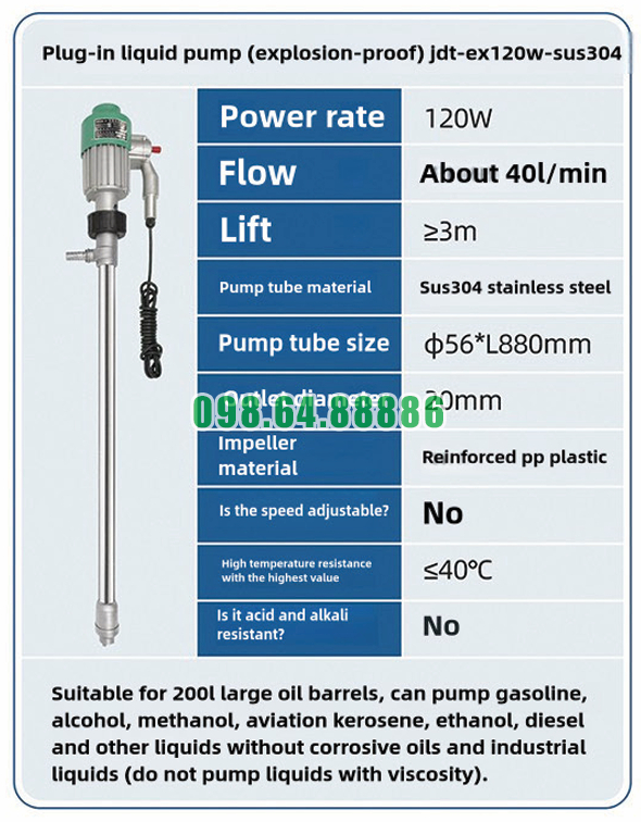 Bơm chất lỏng cắm điện chống cháy nổ JDT-EX120W-SUS304 giúp tiết kiệm thời gian sang chiết dầu