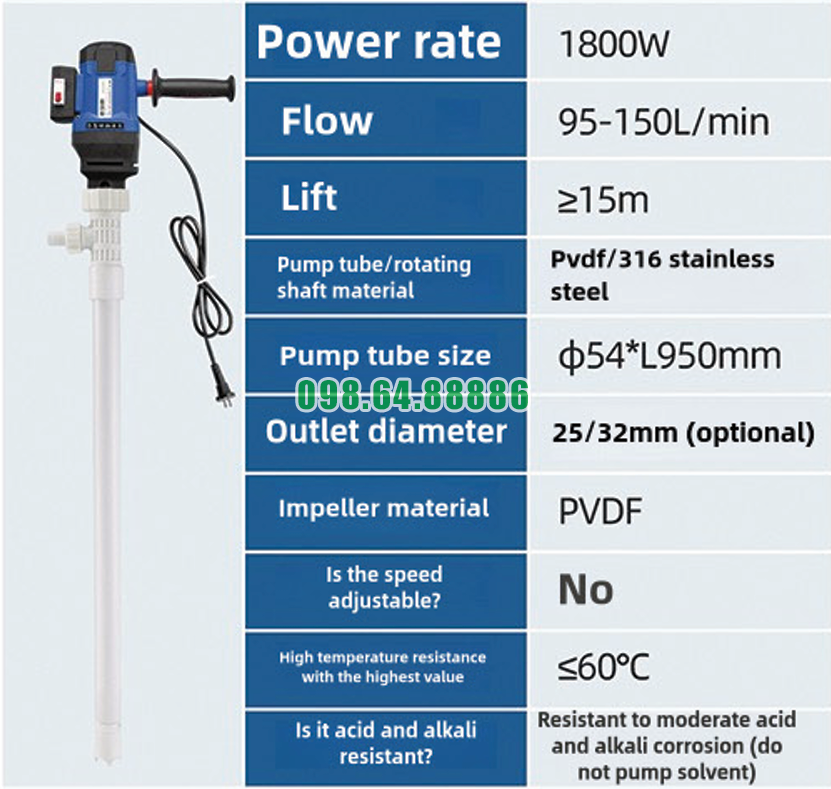 Với khả năng bơm nhanh, vật liệu bền bỉ và ứng dụng linh hoạt trong nhiều lĩnh vực công nghiệp, Máy bơm điện chất lỏng cắm điện JDT-1800W-PVDF đã trở thành lựa chọn đáng tin cậy của nhiều doanh nghiệp và người sử dụng hiện nay.