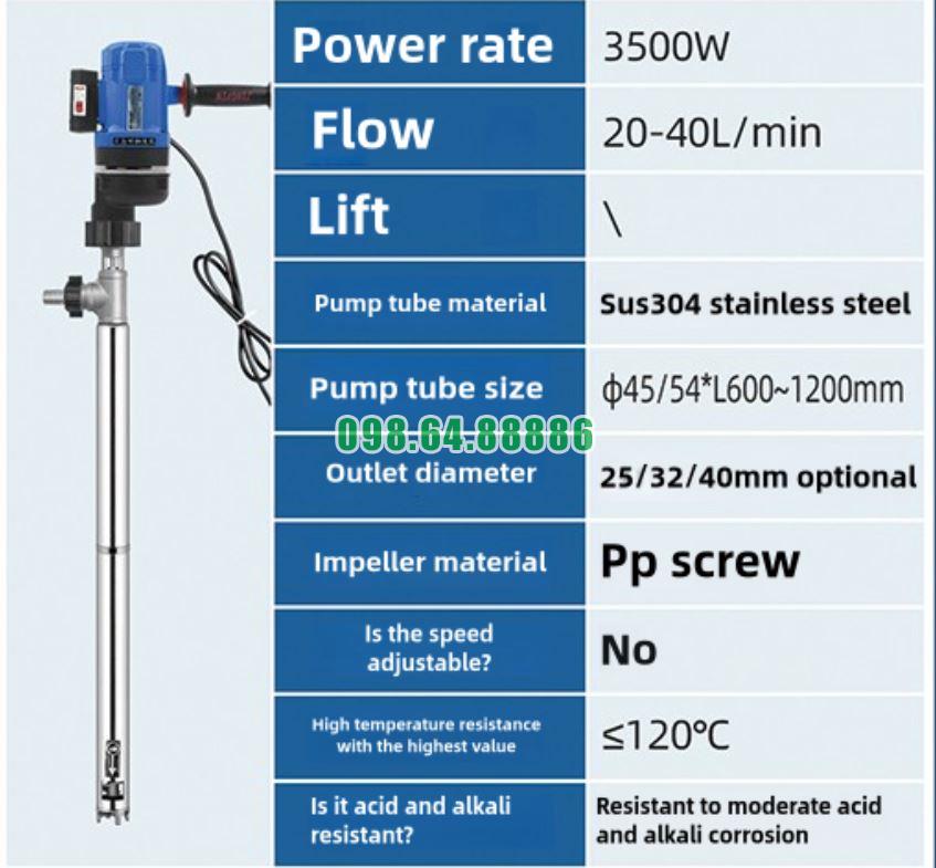 Máy bơm điện cầm tay hút thùng phuy JDT-3500W-LGG120 có khả năng ứng dụng rộng rãi trong nhiều ngành công nghiệp khác nhau, từ bơm dầu công nghiệp, dung môi, hóa chất cho đến các chất lỏng có độ nhớt cao trong ngành thực phẩm và xây dựng. Nhờ vào công suất mạnh mẽ, khả năng làm việc liên tục và vật liệu bền bỉ, máy bơm này là lựa chọn lý tưởng cho những công việc đòi hỏi hiệu suất cao và độ bền lâu dài.