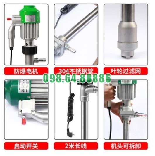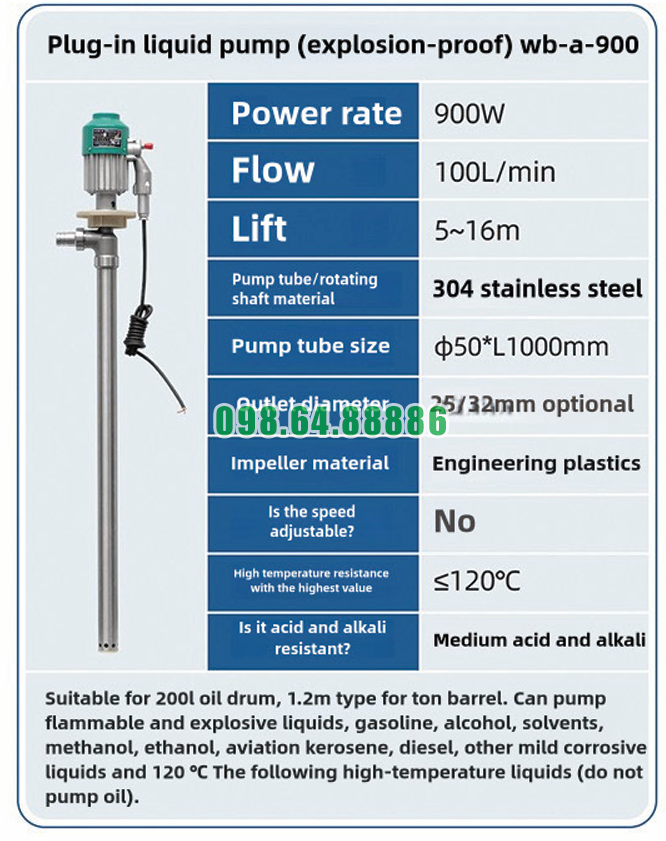 Máy bơm chất lỏng cắm trực tiếp chống cháy nổ WB-A-900 phục vụ việc chiết rót từ thùng phuy 200 lít có thể bơm xăng, dầu diesel, ethanol, methanol và các dung môi công nghiệp khác.