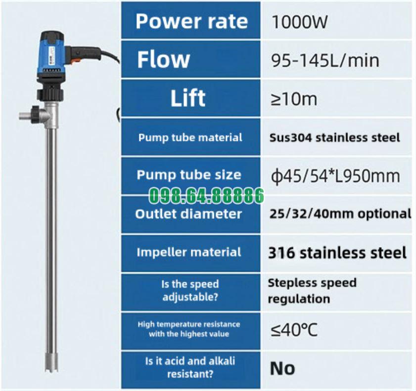 Trong nhóm thiết bị bơm cắm thùng phuy dùng trong công nghiệp, Bơm cắm điện thùng phuy JDT-1000W-304SUS được đánh giá cao nhờ sở hữu nhiều tính năng vượt trội, tạo nên sự khác biệt rõ rệt so với các dòng bơm thông thường. Những tính năng này không chỉ nâng cao hiệu quả làm việc mà còn đảm bảo độ ổn định và độ bền trong quá trình vận hành.