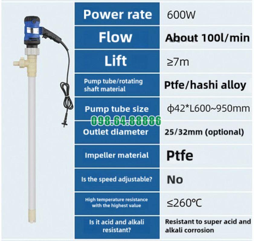 Bơm hóa chất chịu nhiệt 260°C, model JDT-600W-PTFE, dùng cho phuy 20–200L