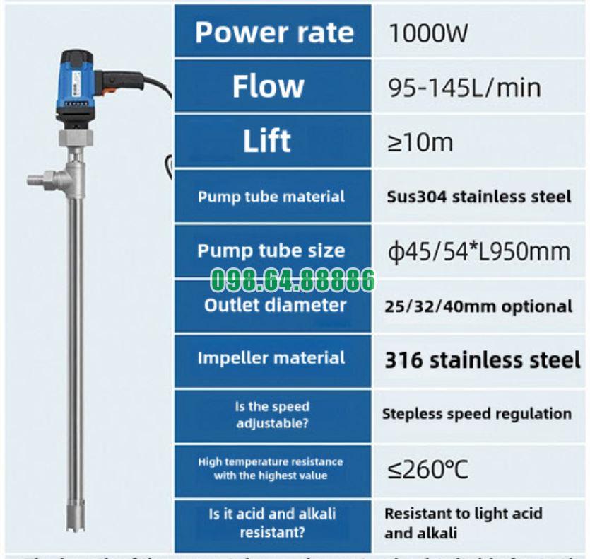 Nhờ kích thước ống bơm phù hợp, vật liệu inox bền bỉ và motor công suất lớn, Máy bơm thùng phuy inox SUS304/316 JDT-1000W-G260 là giải pháp lý tưởng cho thùng 200 lít, mang lại hiệu suất cao, an toàn và độ bền vượt trội trong môi trường công nghiệp hóa chất và dung môi.